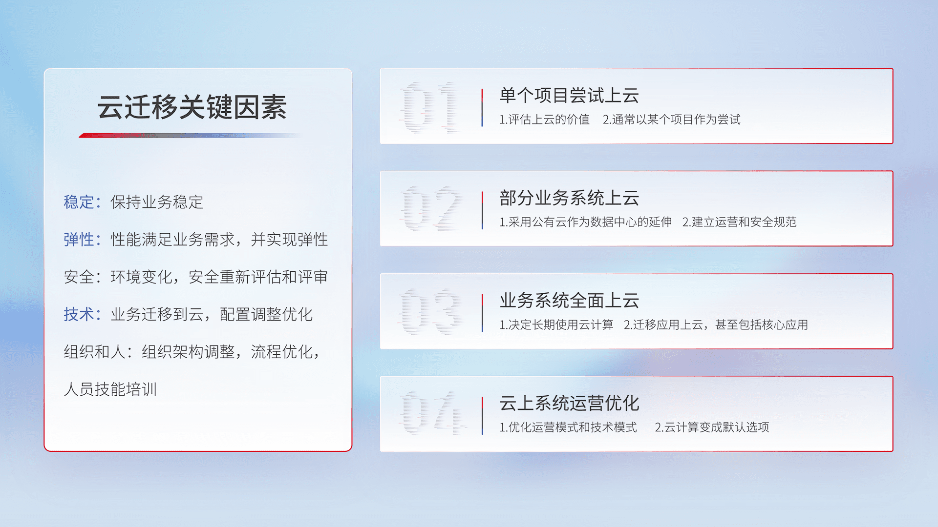 结合实际业务,,,从规划设计、、、、云平台选型、、云原生改造、、、、数据迁移、、、集成交付,,迁移全过程为客户识别最佳上云路径,,,做好风险识别管理,,设计网络架构、、、身份权限、、、、安全审计合规、、操作审计、、、日志审计、、、监控告警策略、、、多站点容灾设计等,,,对云上基础设施进行整体规划,,,,提升IT治理水平,,,以满足弹性、、、、高可用、、、高性能的需求。。